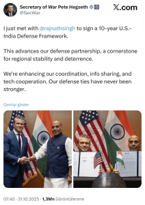 Gelişmeyle ilgili olarak resmi X hesabından paylaşımda bulunan Hegseth, “Hindistan Savunma Bakanı Rajnath Singh ile bir araya gelerek, 10 yıllık ABD-Hindistan Savunma İş Birliği Anlaşması’nı imzaladık. Bu anlaşma, bölgesel istikrar ve caydırıcılığın temel taşı olan savunma ortaklığımızı daha da ileriye taşıyor. Koordinasyon, bilgi paylaşımı ve teknoloji iş birliğimizi güçlendiriyoruz. Savunma alanındaki bağlarımız hiç bu kadar güçlü olmamıştı.” dedi.