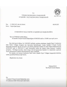 “13/09/2025 tarihinde yapılması planlanan Ataşehir İlçesi Cumhuriyet Halk Partisi 7.Olağan Kongresi için başvuruda bulunulmuştur.