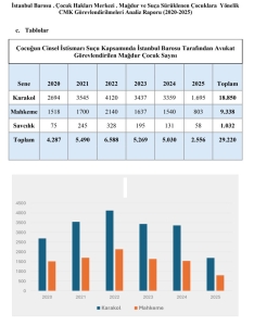 Rapora göre çocuğa karşı cinsel taciz suçu nedeniyle mağdur çocuğa avukat görevlendirme sayısı 2020 ile 2025 temmuzu arasında 6 bin 669 olmuş. Çocuğun cinsel istismarı suçu kapsamında avukat görevlendirilen mağdur çocuk sayısı ise aynı dönemde 29 bin 220.