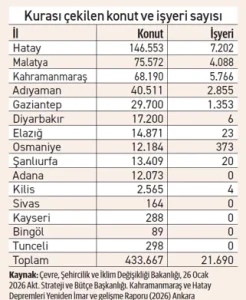 Strateji ve Bütçe Başkanlığı 6 Şubat depremlerinden kısa bir süre sonra 17 Mart’ta ilk raporunu yayınladı. Bu raporda, yıkılan yapılardan altyapı ve insani yardımlara kadar geniş bir yelpazedeki kayıplar yer aldı. Üçüncü yıl dönümü öncesi yayımlanan yeni raporda 433 bin 667 konut, 21 bin 690 işyerinin inşasının tamamlandığı açıklandı. Diğer yandan Ocak 2026 itibariyle Çevre Şehircilik ve İklim Değişikliği Bakanlığı hasar durumu tespitleri değişiklikleri dahil, orta ve daha üst düzey hasarlı konut sayısını 632 bin 667, işyeri sayısını 108 bin 383 olarak belirledi.