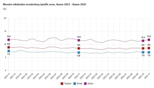 Hanehalkı İşgücü Araştırması sonuçlarına göre; 15 ve daha yukarı yaştaki kişilerde işsiz sayısı 2025 yılı Kasım ayında bir önceki aya göre 54 bin kişi artarak 3 milyon 98 bin kişi oldu.