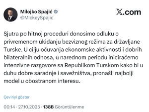 Karadağ Başbakanı Milojko Spajić X’teki paylaşımında bugün (27 Ekim) Türk vatandaşlarına vizesiz seyahati askıya alacaklarını duyurdu.