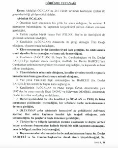 TBMM Milli Dayanışma Kardeşlik ve Demokrasi Komisyonu adına 24 Kasım’da İmralı’ya giden AK Partili Hüseyin Yayman, DEM Partili Gülistan Kılıç Koçyiğit ve MHP’li Feti Yıldız’ın Abdullah Öcalan’la yaptıkları görüşmenin 16 sayfalık tutanakları TBMM’nin sitesinde yayınlandı.