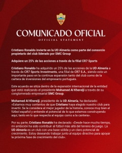 Kariyerine Suudi Arabistan ekibi Al Nassr’da devam eden Ronaldo şunu söyledi: “Futbola, sahanın ötesinde katkıda bulunmak uzun zamandır hayalimdi. Almeria, güçlü temellere ve açık bir büyüme potansiyeline sahip bir İspanyol kulübü.”
