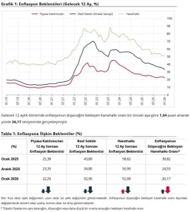 Türkiye Cumhuriyet Merkez Bankası’nın (TCMB) Piyasa Katılımcıları Anketi, İktisadi Yönelim Anketi ve Türkiye İstatistik Kurumu iş birliğiyle yürütülen Tüketici Eğilim Anketi ile finansal ve reel sektör uzmanlarının, imalat sanayi firmalarının ve hanehalkının 12 ay sonrası yıllık tüketici enflasyonu beklentileri derlenerek elde ettiği “Sektörel Enflasyon Beklentileri” ocak ayı verilerine göre 12 ay sonrası yıllık enflasyon beklentileri bir önceki aya göre, piyasa katılımcıları için 1,15 puan azalarak yüzde 22,20 seviyesine, reel sektör için 1,90 puan azalarak yüzde 32,90 seviyesine gerilerken, hanehalkı için 1,18 puan artarak yüzde 52,08 seviyesine yükseldi.