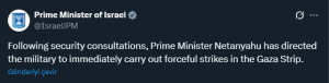 Güvenlik istişarelerinin tamamlanmasının ardından Başbakan Netanyahu, askeri liderliğe Gazze Şeridi’ne derhal güçlü saldırılar başlatılması talimatını verdi.