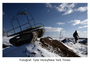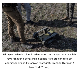 Robotlar doğu Ukrayna’daki bir vadiden savaş alanına doğru ilerledi; çimenlerin üzerinden geçerek bir Rus mevzisine doğru gidiyorlardı. Aslında küçük yeşil ‘arabacık’lara benzeyen bu araçlar, bahçe mağazalarında toprak torbalarını taşımak için satılan el arabalarına benziyordu. Ancak her biri yaklaşık 30 kilogram patlayıcı taşıyordu.