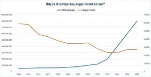 2024 yılına girerken 400 milyon TL olan büyük ikramiye 17 bin 2 TL olarak ödenen 23 bin 526 asgari ücrete geriledi. 2025’te ise 27 bin 144 asgari ücret karşılığına denk gelen yılbaşı ikramiyesi, 2026 yılı asgari ücreti henüz belli olmazken, ikramiyeyle aynı oranda yüzde 33 zam gelmesi halinde 27 bin 212 asgari ücrete denk gelecek. 2014’e göre asgari ücret karşılığı yaklaşık yarı yarıya gerilemiş olacak.