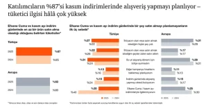 PwC’nin Fransa, Almanya, İtalya, İrlanda ve Türkiye’yi kapsayan, 18-65 yaş arası Türkiye’den 2.000, toplamda 10.000 katılımcı ile ikinci kez gerçekleştirdiği “Efsane Cuma Dosyası 2025” araştırmasına göre, Türkiye’deki tüketicilerin yüzde 87’si kasım ayı indirim dönemlerinde alışveriş yapmayı planlıyor. Geçen yıl bu oran yüzde 85 düzeyinde olurken, Avrupa’da ise değişmeyerek yüzde 83’te kaldı.