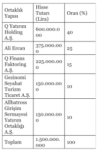 İzmir merkezli bankanın internet sitesine göre Q Yatırım Bankası’nın ortaklık yapısı şöyle:
