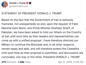 ABD Başkanı Donald Trump, İran’ın Pakistan’a heyet göndermeyeceğini duyurmasının ardından yaptığı yazılı açıklamada, “Pakistan’dan gelen talep ve İran’ın bölünmüşlüğünü dikkate alarak Tahran’dan teklif gelene kadar ateşkesi süresiz uzattım” ifadelerini kullandı.