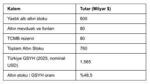 Jeopotilik endişelerin de etkisiyle 5,000 doların üzerine yükselen altın, çoğu yastık altı olmak üzere Türkiye’deki toplam altın varlığını da, 1.5 trilyon dolarlık toplam GYSH’nin yarısına ulaştırdı. Bu sürecin yarattığı servet artışı ve harcama etkisi ise dezenflasyonu yavaşlatan bir etken oldu.