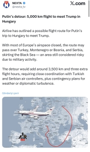 GazeteOksijen’in aktardığına göre Rusya Devlet Başkanı Vladimir Putin’in, ABD Başkanı Donald Trump ile yapılacak Budapeşte Zirvesi’ne giderken izleyeceği güzergah belli oldu. Rus liderin uçağı Karadeniz, Türkiye, Yunanistan kıyıları, Arnavutluk, Karadağ ve Sırbistan üzerinden geçecek.