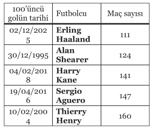 Premier Lig rekoru şöyle duyurdu: “Haaland, 100 gole ulaşmak için sadece 111 maç oynadı ve bunu başaran en hızlı oyuncu olarak Alan Shearer’ın 124 maçlık rekorunu geride bıraktı.”
