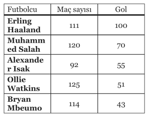 Listede aynı dönemde 70 golle Muhammed Salah ikinci, Alexander Isak’se 55 golle üçüncü sırada yer alıyor.