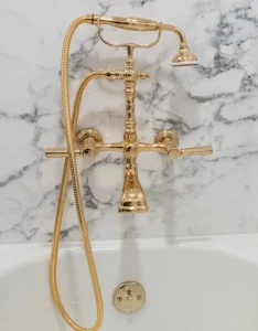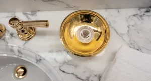 Banyonun yeni görüntüsünde bataryalardan çöp kovasına kadar altın tonları dikkat çekti.
