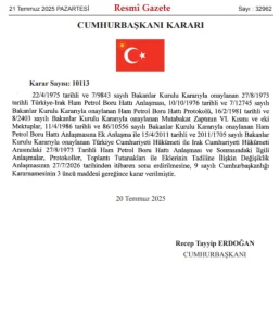 Buna göre Türkiye-Irak Ham Petrol Boru Hattı Anlaşması, Ham Petrol Boru Hattı Protokolü ve diğer ilgili anlaşmayla protokoller 27 Temmuz 2026’da sona erecek.