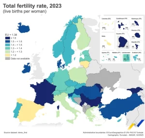 Avrupa İstatistik Ofisi’nin (Eurostat) 2023 verilerine göre AB’deki toplam doğurganlık hızı ortalaması 1,38.