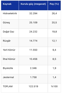 2025 sonu itibarıyla elektrik kurulu gücünün kaynaklara göre dağılımı ise şöyle: