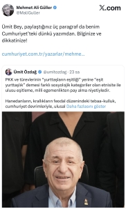 Cumhuriyet yazarı Mehmet Ali Güller, Özdağ’ın paylaşımını alıntılayarak, “Ümit Bey, paylaştığınız üç paragraf da benim Cumhuriyet’teki dünkü yazımdan. Bilginize ve dikkatinize!” dedi ve yazısının linkini paylaştı.