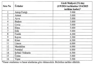 Buna göre maliyet; kayısı için 5 bin 500, Antep fıstığı için 5 bin, kiraz için 6 bin, şeftali için 6 bin 500 lira olacak.