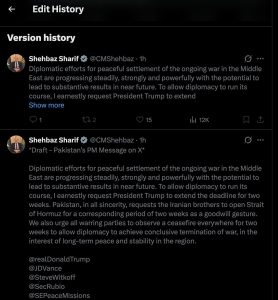 Gece geç saatlerde alınan ateşkes kararı öncesinde yürütülen müzakerelerle ilgili Pakistan Başbakanı Şahbaz Şerif’in paylaşımları tartışma yaratmıştı. Şerif’in paylaşımının başında yer alan “Taslak – Pakistan Başbakanı’nın X Mesajı” ifadesi, mesajın Donald Trump tarafından yazıldığı iddialarını gündeme taşımıştı.