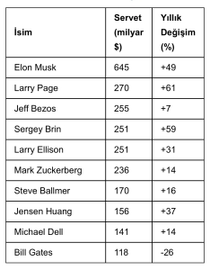 Listenin dikkat çeken istisnası ise Microsoft’un kurucusu Bill Gates oldu. Gates, yıl sonunda serveti yıl başına göre düşen tek teknoloji milyarderi olarak kayda geçti. Bunun nedeni, Gates’in yazılım devindeki hisselerini satarak hayırseverlik faaliyetlerini finanse etmeyi sürdürmesi oldu.
