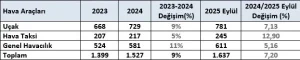 Sivil Havacılık Genel Müdürlüğü verilerine göre ülkemizde; 2025 yılı Eylül ayı itibarıyla 781 uçak, 245 hava taksi, 611 genel havacılık olmak üzere toplam 1.637 hava aracı bulunuyor.